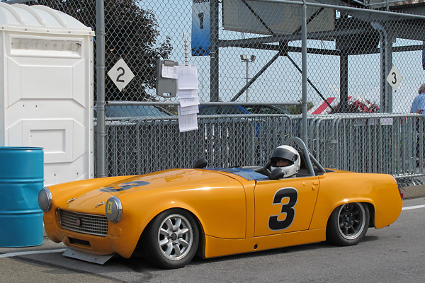 Coming off the scales after winning his race. 1275cc Spridgets are required to weigh at least 1470#, plus 20# if "no headlights", plus 25# if "no charging system", plus 20# if "removal of passenger seat". |