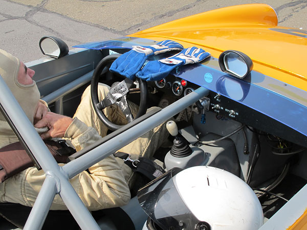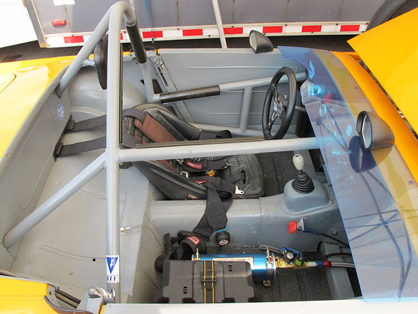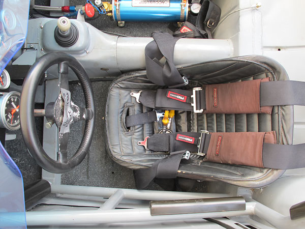 Lecarra steering wheel mounted on a quick release hub. G-Force 5-point harness (w/ Pyrotech pads). |